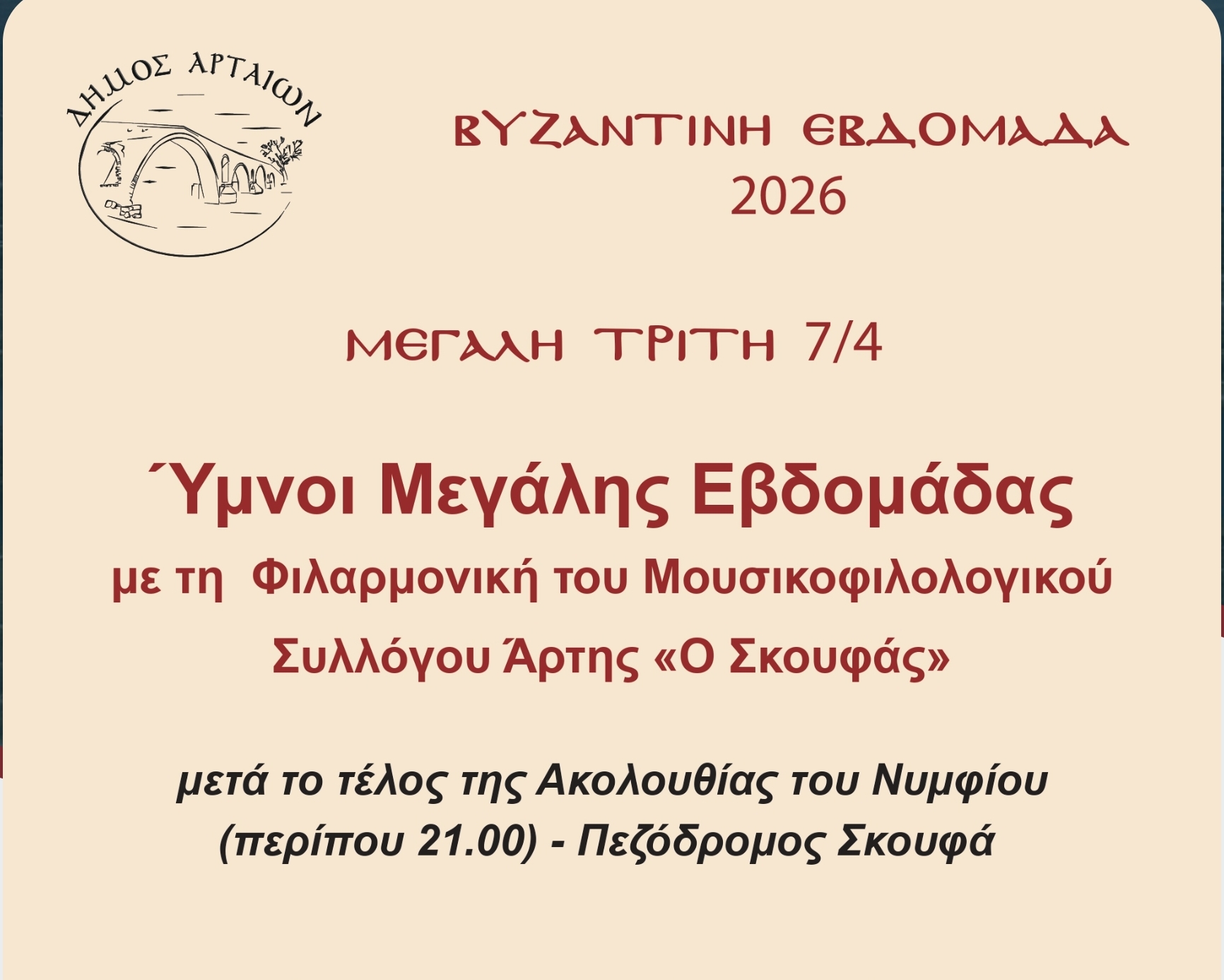 Μετά την Ακολουθία του Νυμφίου, στον πεζόδρομο της οδού Σκουφά θα ακουστούν Ύμνοι της Μεγάλης Εβδομάδας, που θα αποδώσει με ευαισθησία η Φιλαρμονική του Μουσικοφιλολογικού Συλλόγου Άρτης «Ο Σκουφάς». Μέσα στην ατμόσφαιρα κατάνυξης, η μουσική της Φιλαρμονικής σηματοδοτεί με τον πιο όμορφο τρόπο -αυτόν της μουσικής- την πορεία προς την Ανάσταση!